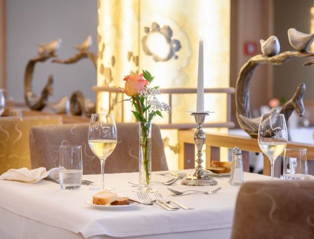 - Nutzung des Wellnessbereichs: Hallenbad & Ruhe-Wintergarten, Freibad & Liegewiese (Mai-Sept), Fitnessraum, Saunalandschaft mit Blockhaus-Sauna, Salzgrotte, Dampfbad, Whirlpool, Freiluftbereich, Ruhe-Pavillon, Raum der Stille mit temperierten Wasserbetten, Tee-Lounge mit Kamin